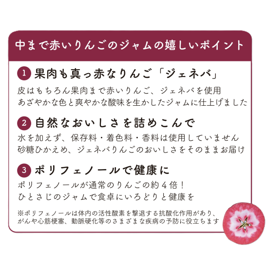 中まで赤いりんご[「ジェネバ」だからこその、赤く甘酸っぱいりんごジャムを、是非お試しください。